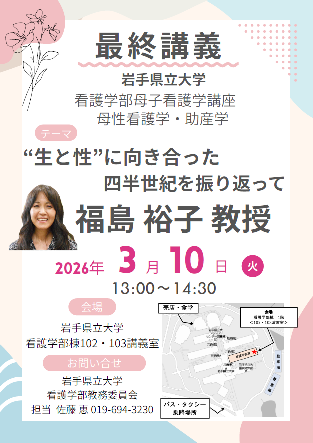 令和8年3月10日(火)、岩手県立大学看護学部において、福島裕子教授による最終講義が開催されました。四半世紀にわたり本学の教育・研究の発展に尽力されてきた福島先生の最後を飾る講義に、学内のみならず、地域医療に携わる卒業生や関係者も多数駆けつけました。